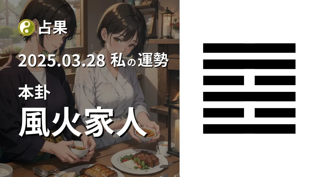 一方、綜卦の火沢睽が「意見の衝突」を示しており、今日は身近な人との意見の違いが表面化するかもしれない。しかし、風火家人の示す「調和」の精神を持ち、冷静に対応することで、良い結果につながるだろう。