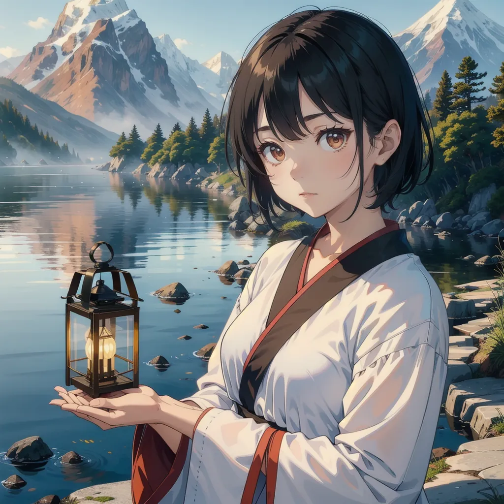 背景には朝靄がかかり、山の輪郭が柔らかく浮かび上がり、「力を秘めた静けさ」が漂います。彼女の姿は、表に出ずとも影響力を持つ人の生き方を象徴し、「謙遜こそが真の強さ」という卦の教えを体現しています。